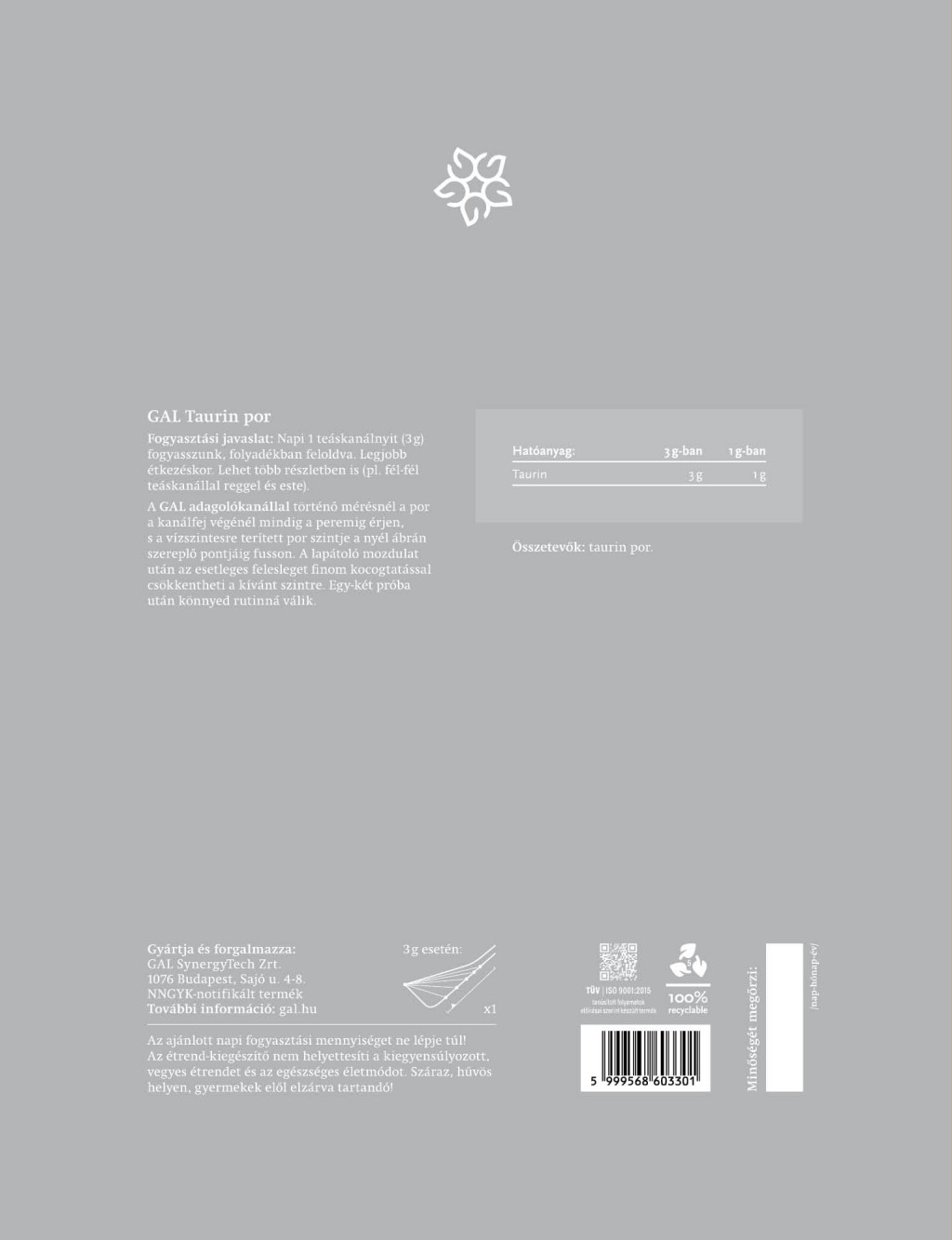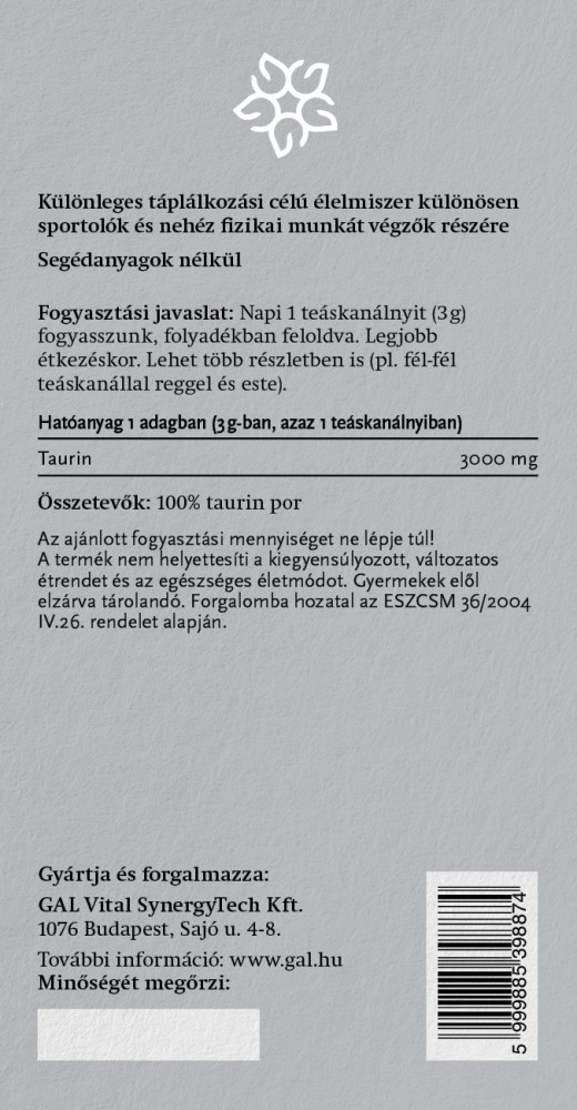 GAL 100% Taurin por utántöltő 500g, 3 g x 166 adag (1 g x 500 adag)