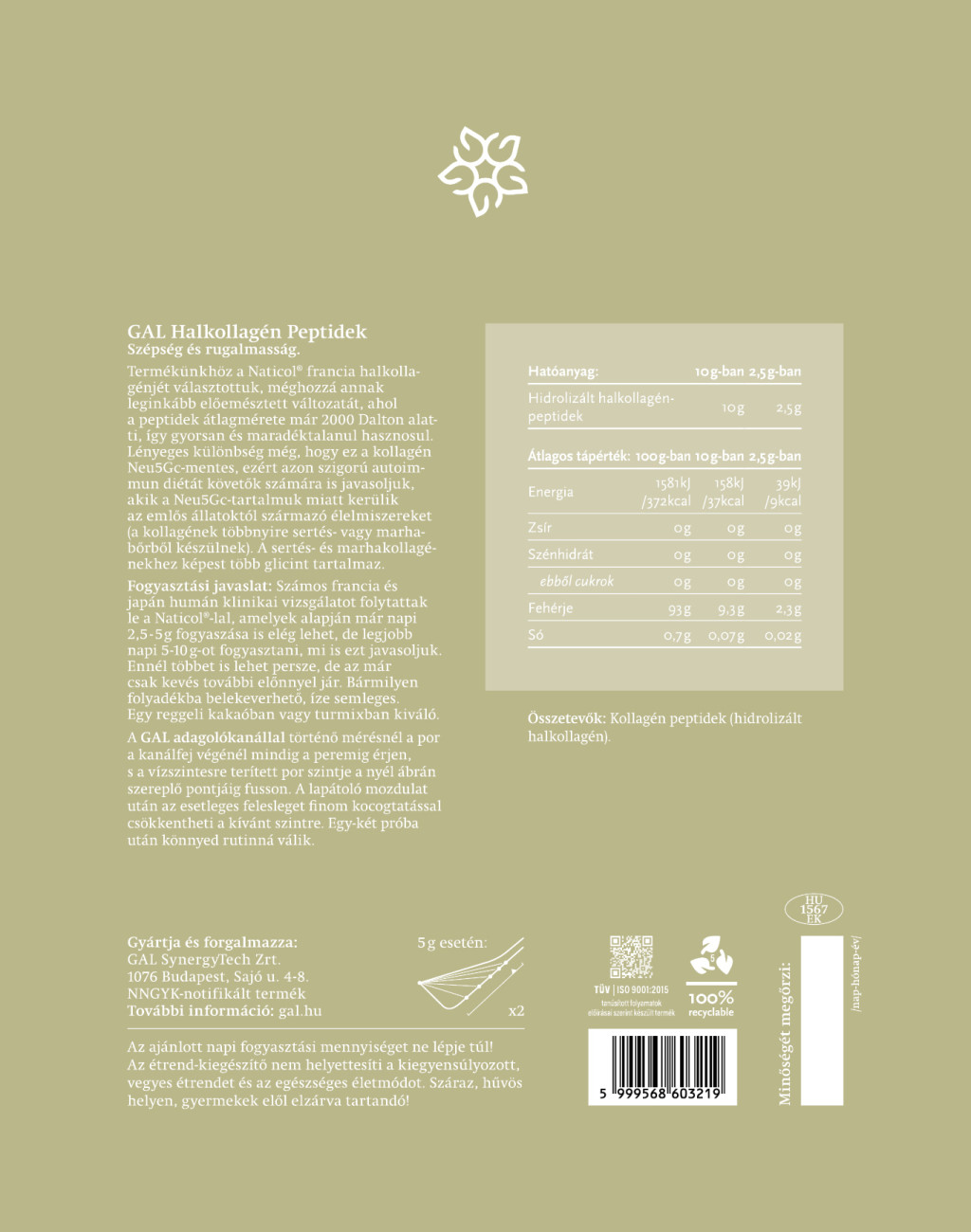 eu5Gc-mentes, 2000Dalton alatti peptidméretű, közel 100%-ban hasznosuló, extra minőségű halkollagén.