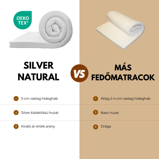 Silver Natural fedőmatrac egy 5 cm (+/-1 cm) vastagságú, feszes félkemény komfortnövelő réteg, amely praktikus és hatékony megoldás lehet mindazok számára, akik meglévő matracuk fekvőfelületét szeretnék kényelmesebbé, egyenletesebbé tenni. Az idővel elhasználódott, túl kemény vagy kényelmetlen matracok esetében ez a fedőmatrac gyorsan és egyszerűen orvosolhatja a komforttal kapcsolatos problémákat, anélkül, hogy új matracba kellene beruházni.